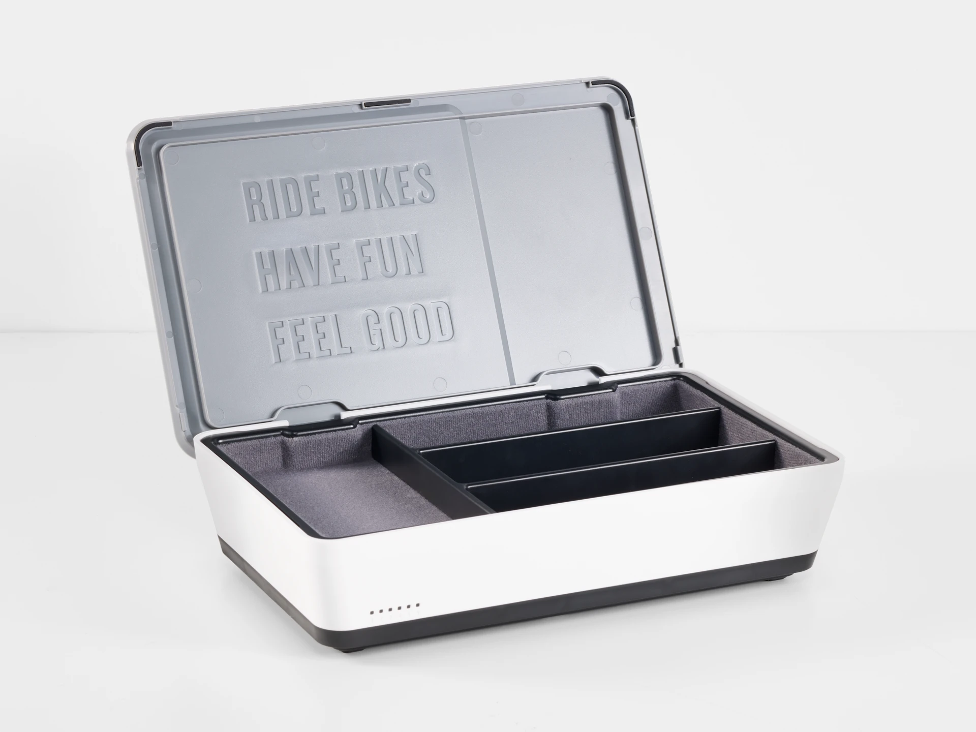 A estação de carregamento Trek CHRGtime é a melhor forma de carregar todos os teus acessórios de ciclismo em simultâneo. Carrega na perfeição até seis luzes de ciclismo, ciclocomputadores e outros aparelhos numa estrutura refinada que organiza a tua zona de carregamentos, mantendo bem arrumados e ocultos os cabos de carregamento USB e USB-C incluídos.