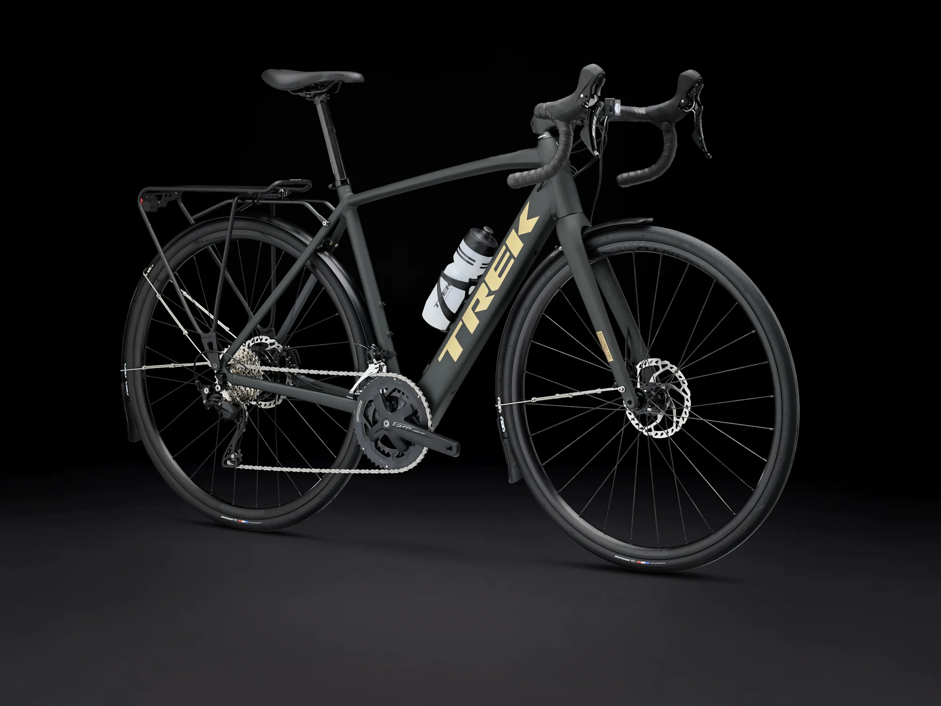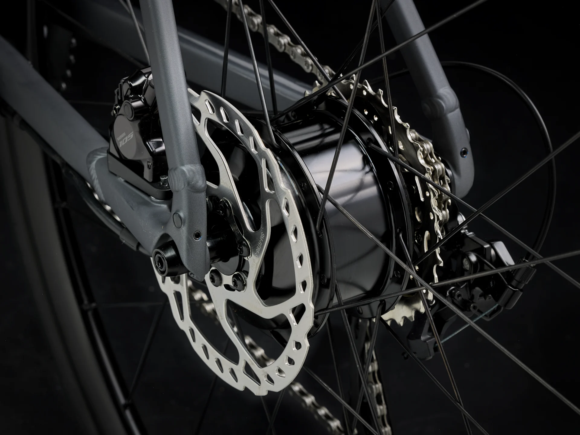 Domane+ carbon, tapered alloy steerer, internal brake routing, fender mounts, flat mount disc, 12x100mm thru axle